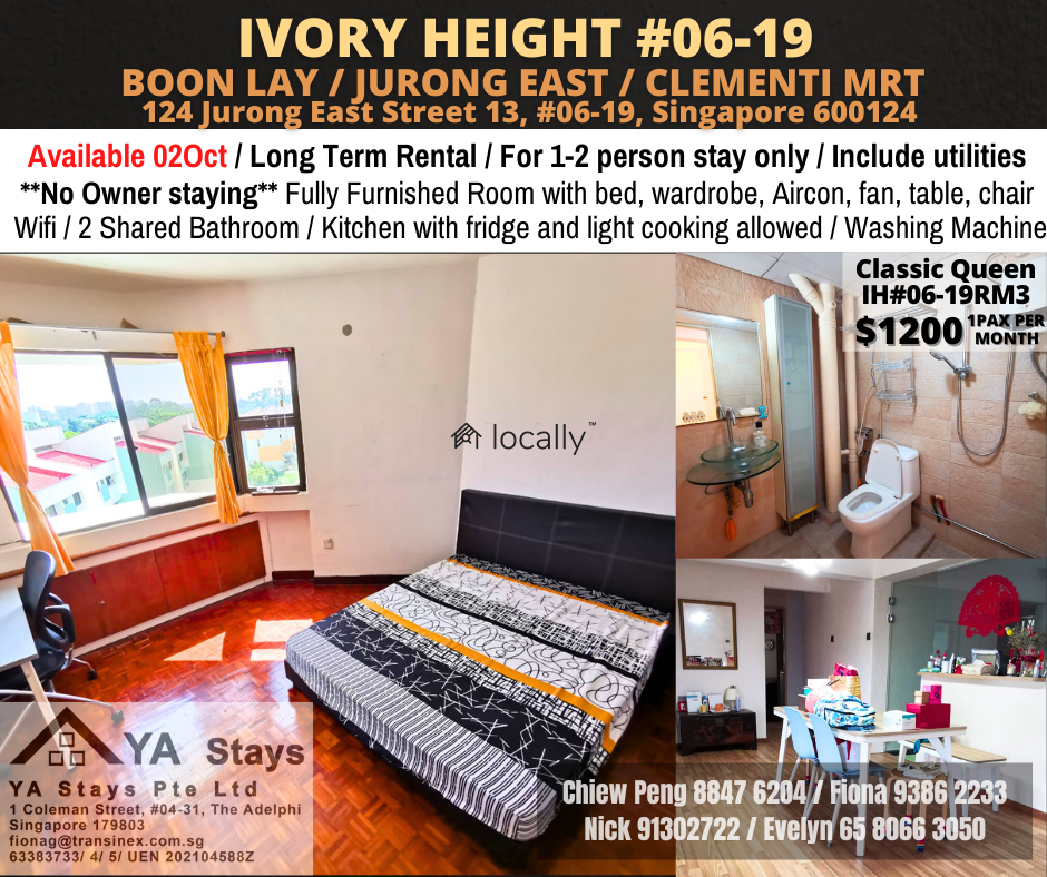 IVORY HEIGHT #06-19RM3 – 经典大床房出租 位置:新加坡裕廊东13街124号,#06-19,邮编:600124 步行距离: